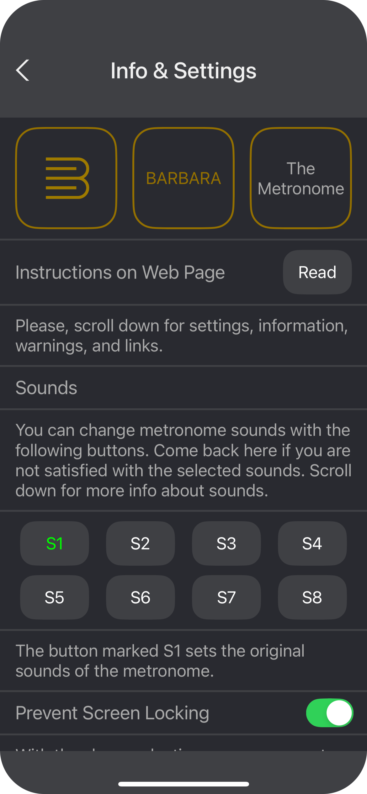Then, if you want to control the metronome sound without the sound volume buttons of your device, you must activate Volume Control & Silencing in Info & Settings.