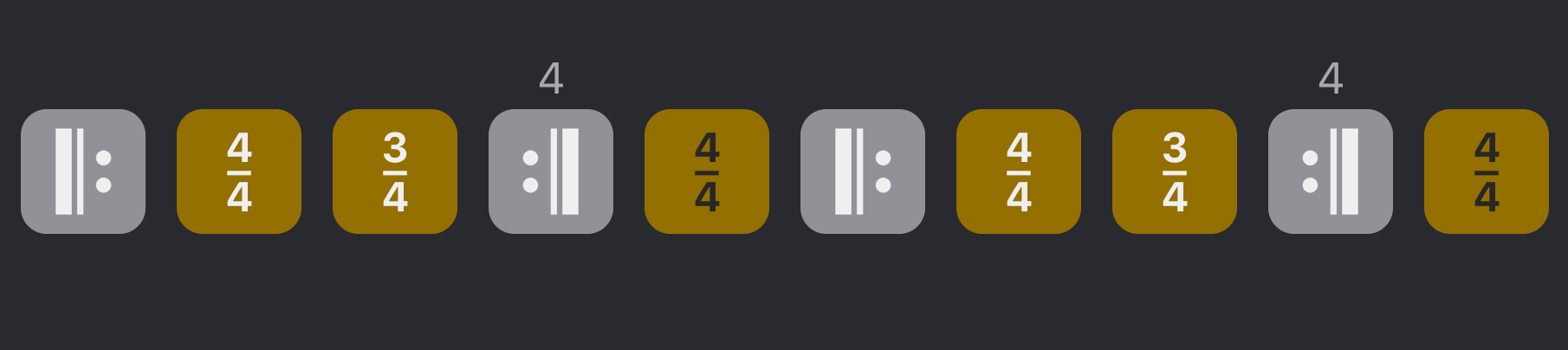 When some bars are surrounded by repeat signs, the bars can be played many times. By pressing the button with the right repeat sign over and over, you'll see a number that indicates how many times the bars between the repeat signs will be played.
