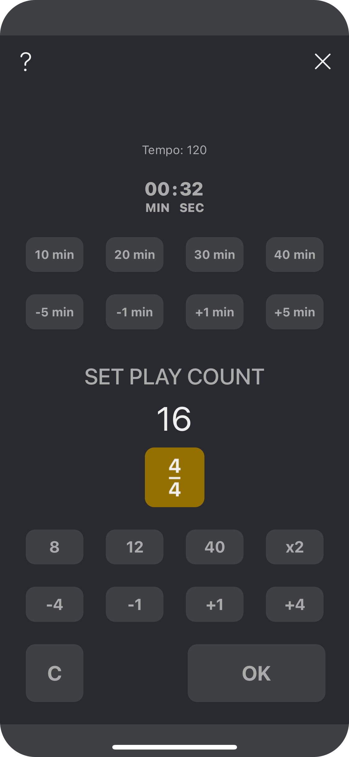 After a long press, it will be possible to set the play count of the bar with numbers. If a tempo is defined earlier in the sequence, the following screen is shown, and play count can be set by setting play minutes.