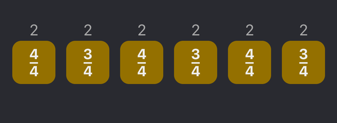 By following this logic, it is possible to make rare time signatures. For example, you can think that the following sequence contains two bars with time signatures 9/4 and 11/4.