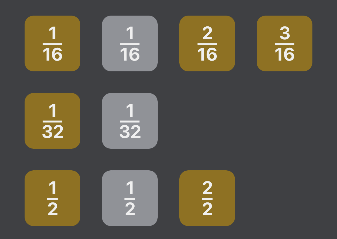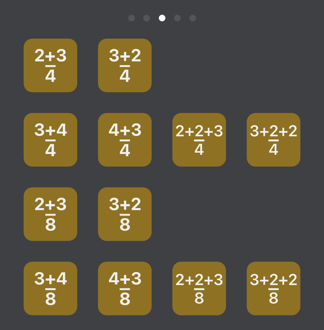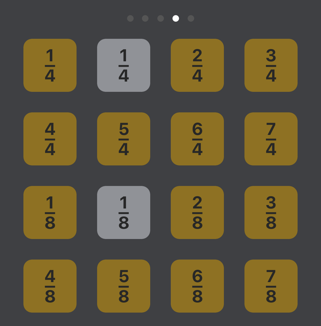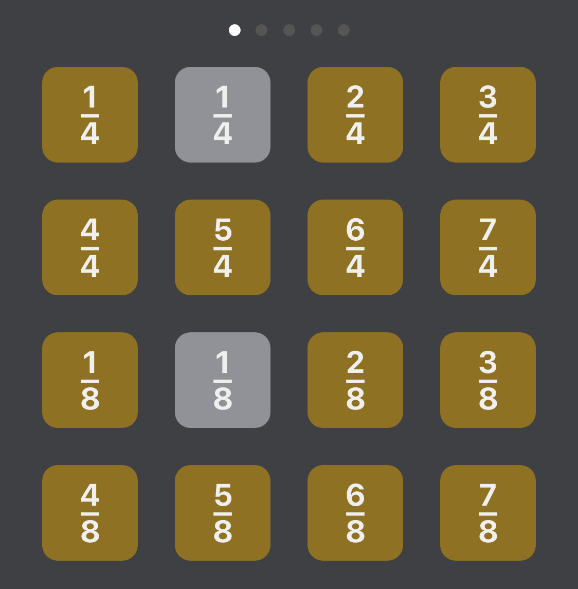 Although all these buttons are called bar buttons, the buttons in which the upper numeral is 1 can be considered as single notes which the metronome plays. See section Rare Time Signatures to find information about the grey buttons.