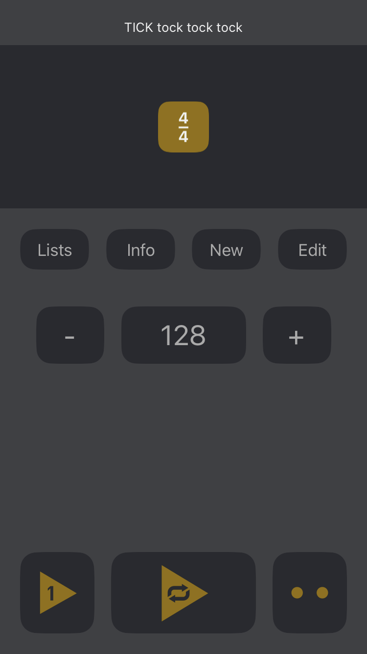 BARBARA plays sequences of metronomic bars (measures). In the picture below a sequence named "TICK tock tock tock" is loaded into the metronome. The sequence has only a single 4/4 bar, but it is considered a sequence in BARBARA.