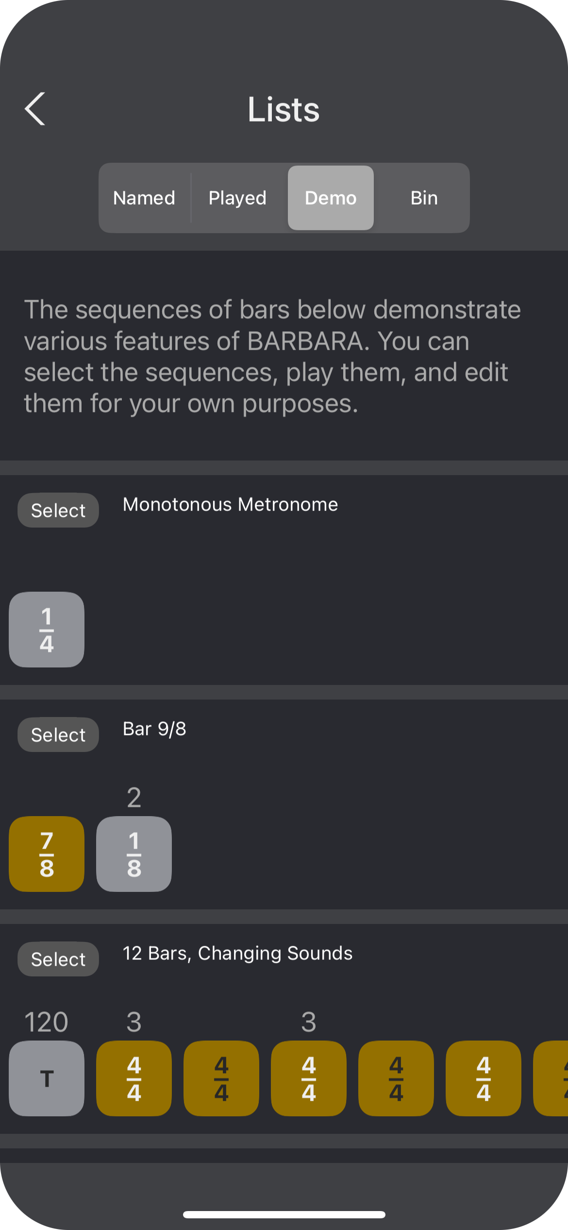 This list should help you to learn how BARBARA can be used. The demos show various features of the metronome.