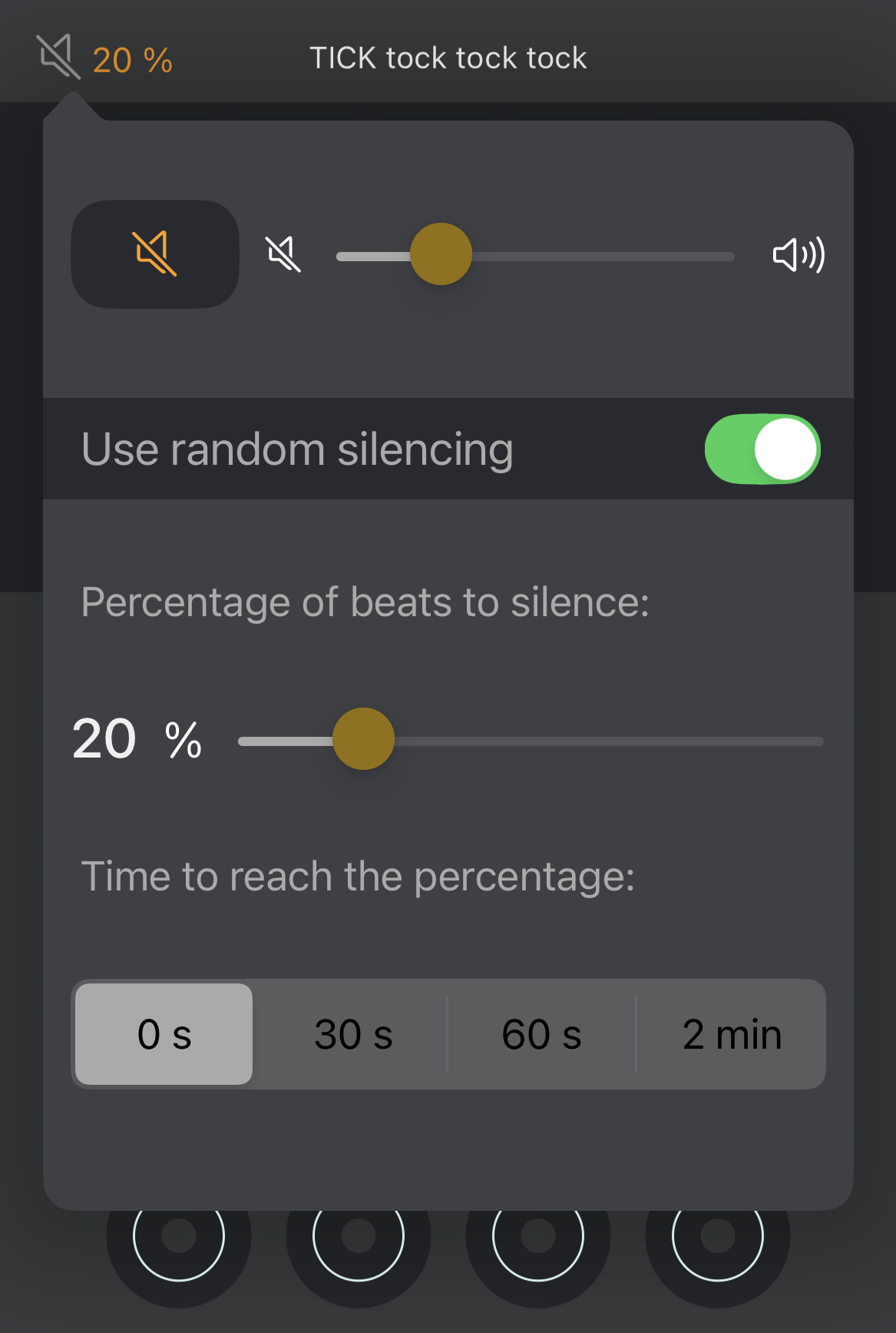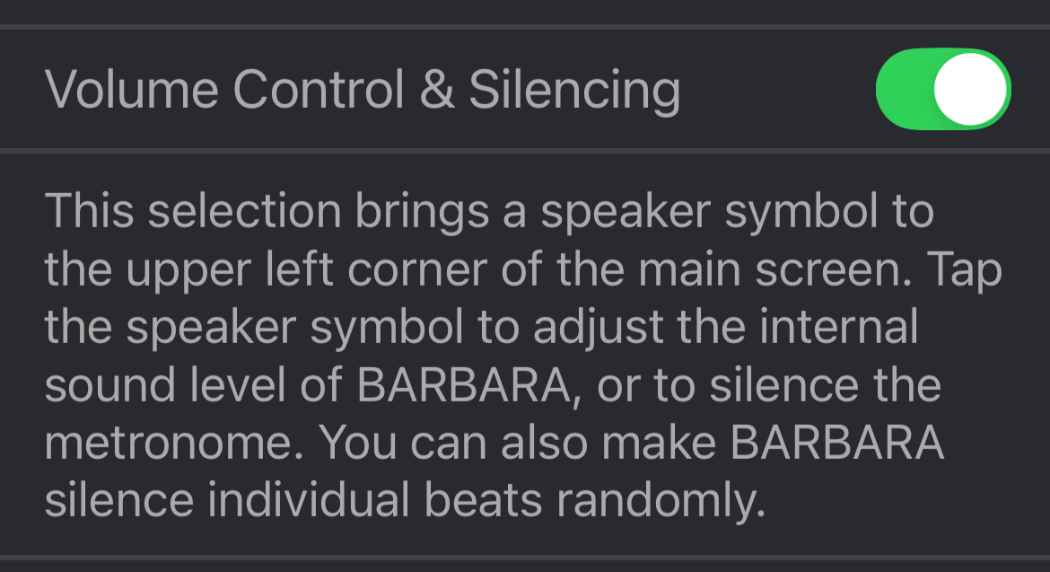 When Volume Control & Silencing is activated, you can also make the metronome silence beats randomly. This means that the metronome plays the rhythm correctly, but sometimes the sound of a beat is not heard.