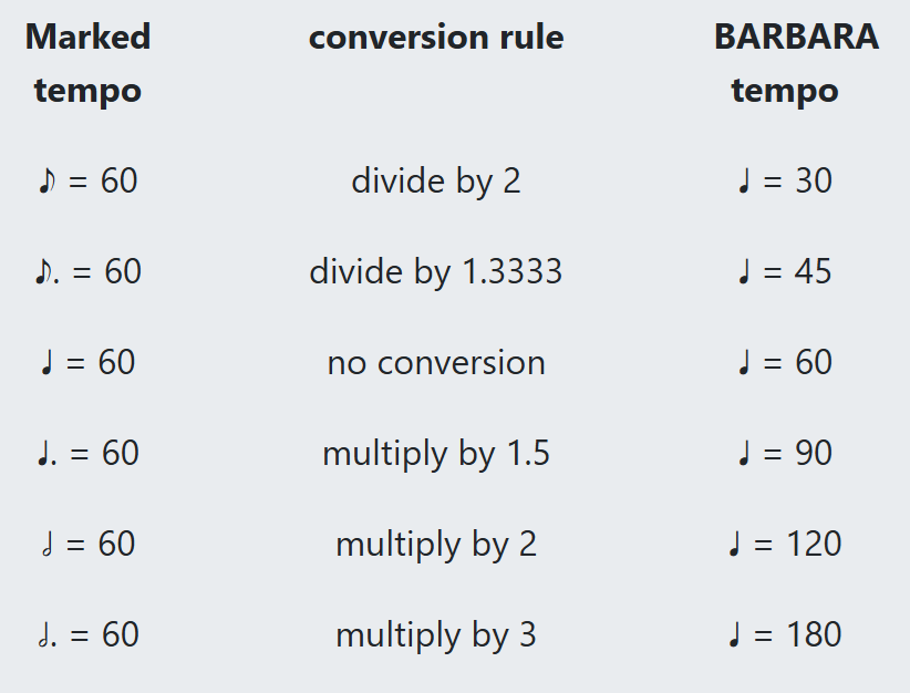 The following examples should help you to do the necessary tempo conversions for BARBARA.