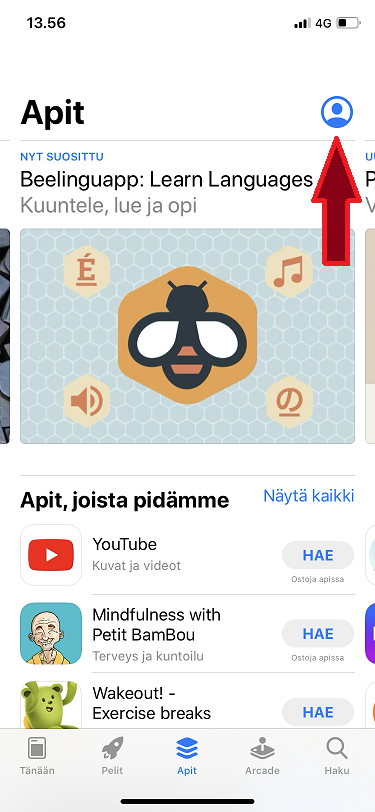 Tuo ikoni saattaa näyttää erilaiselta, jos olet jo kirjautunut App Storeen. Jos et ole kirjautunut, tässä vaiheessa sinua pyydetään kirjautumaan Apple ID:lläsi. On mahdollista että App Store käyttää ns. kaksivaiheista todennusta, jolloin sinun täytyy syöttää vielä koodi, jonka Apple lähettää sen jälkeen kun olet antanut salasanasi.