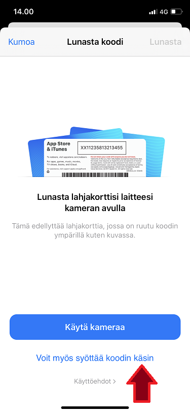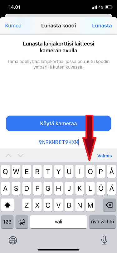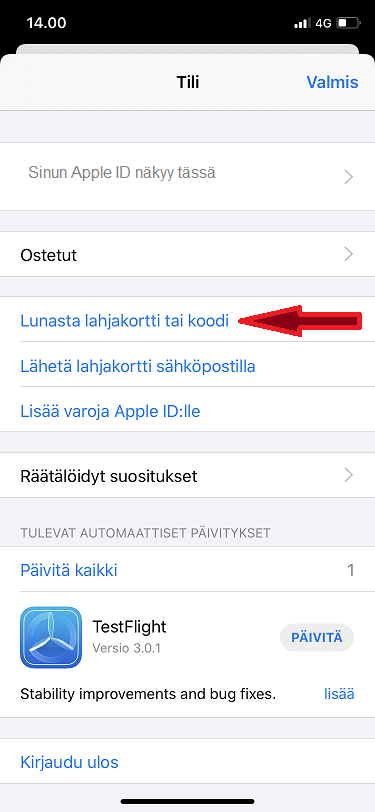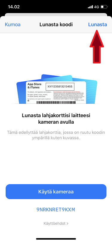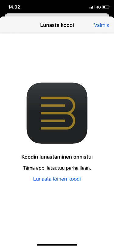 Ennen lunastamista kannattaa varmistaa että kirjoitit koodin oikein. Voi kestää muutamia sekunteja kun App Store varmistaa koodisi oikeellisuuden.